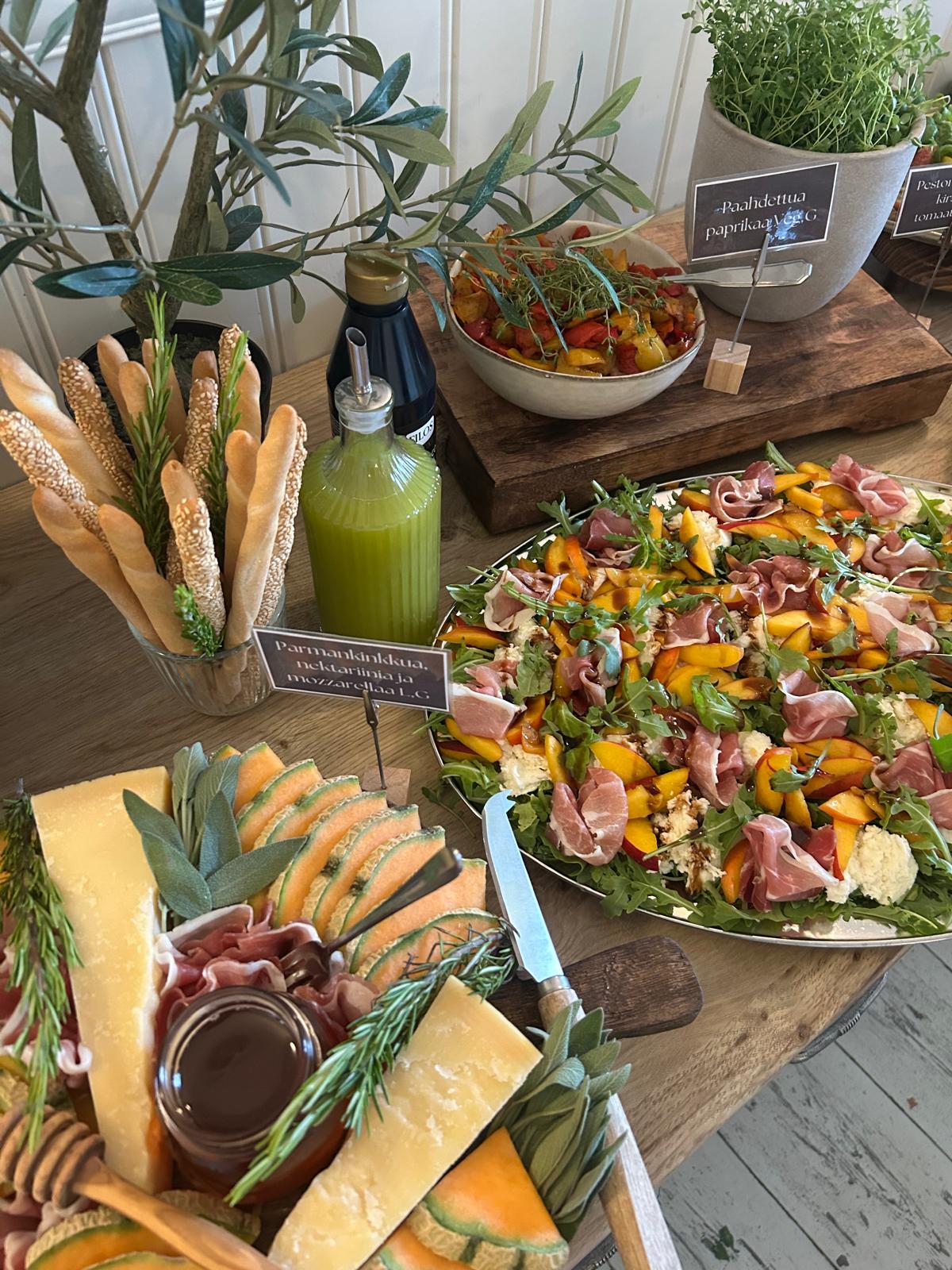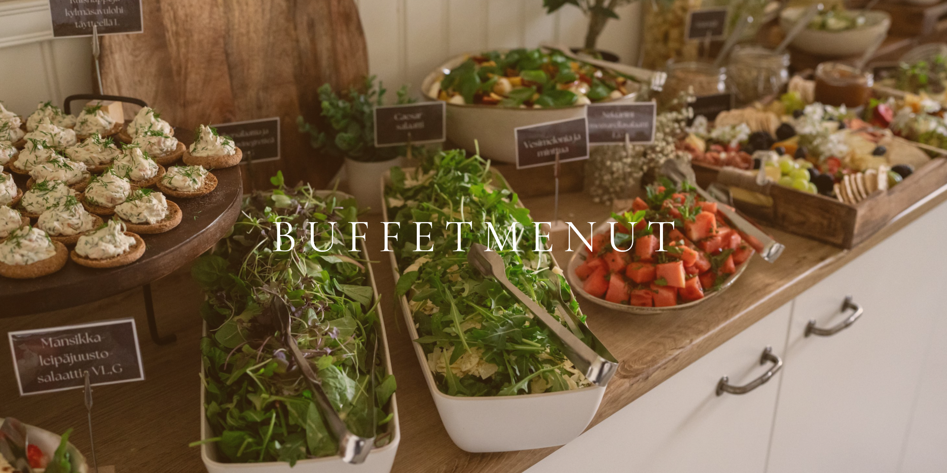 Runsaat ja näyttävät buffetimme kokoavat juhlaväen yhteen nauttimaan rennosti ruuasta ja yhdessäolosta. Meille hyvä ruoka ei ole vain makuja, se on osa juhlan tunnelmaa. Siksi sen kuuluu näyttää yhtä hyvältä kuin se maistuu. Kattauksiemme sydän onkin kaunis ja värikäs salaattien ja alkupalojen kokonaisuus.