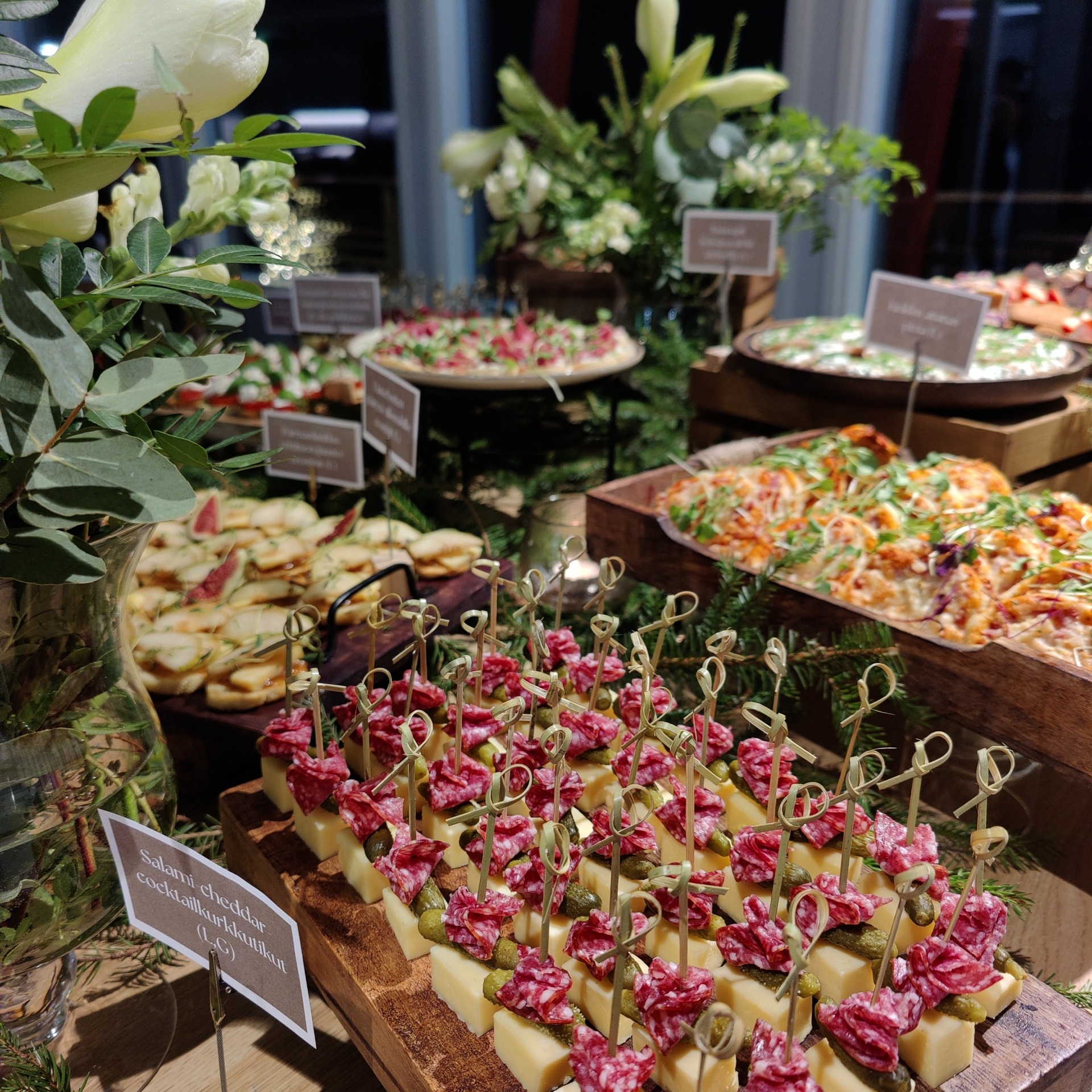 Lisäksi salami-juusto-cocktailkurkkutikkuja (L,G)