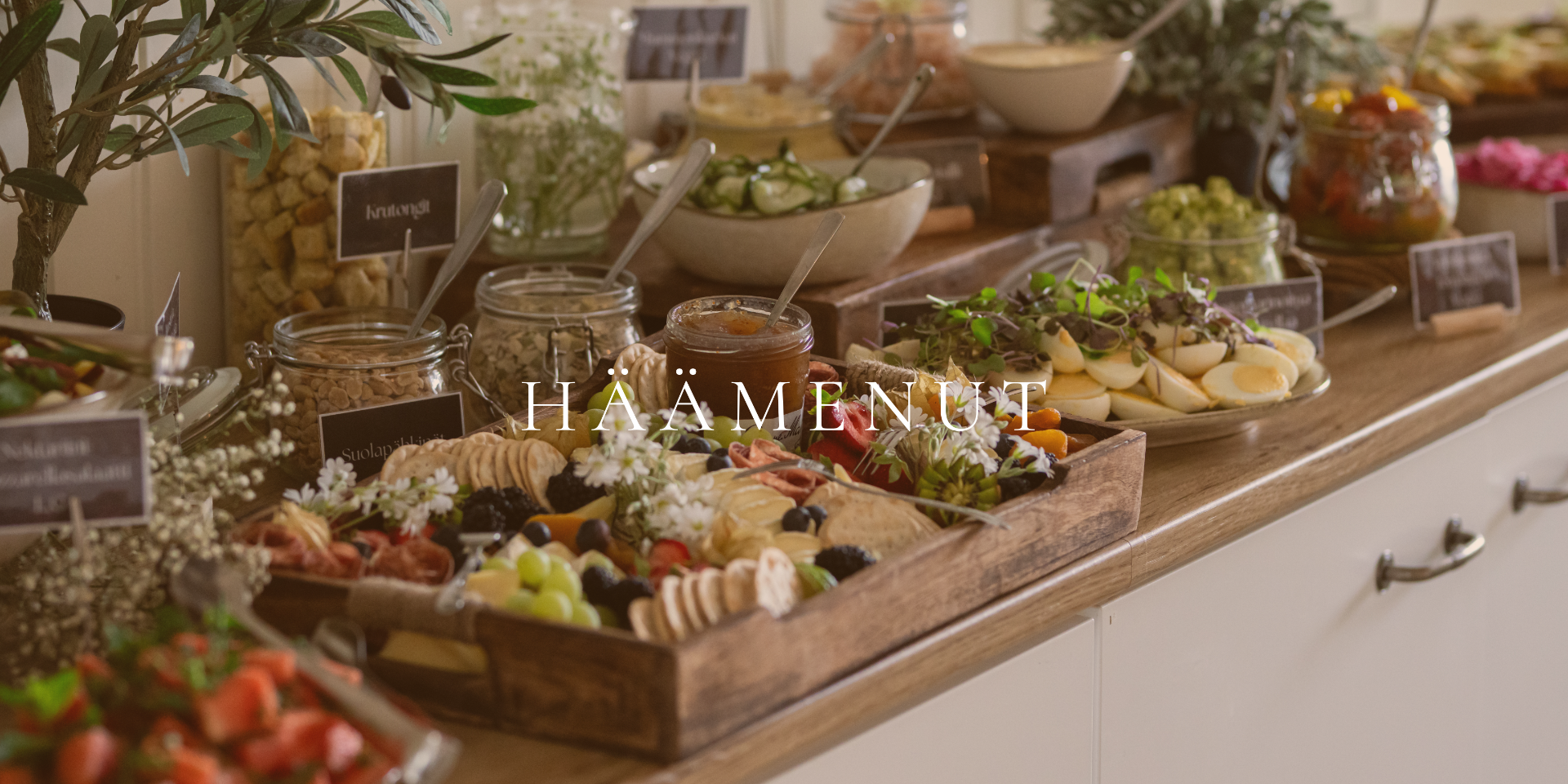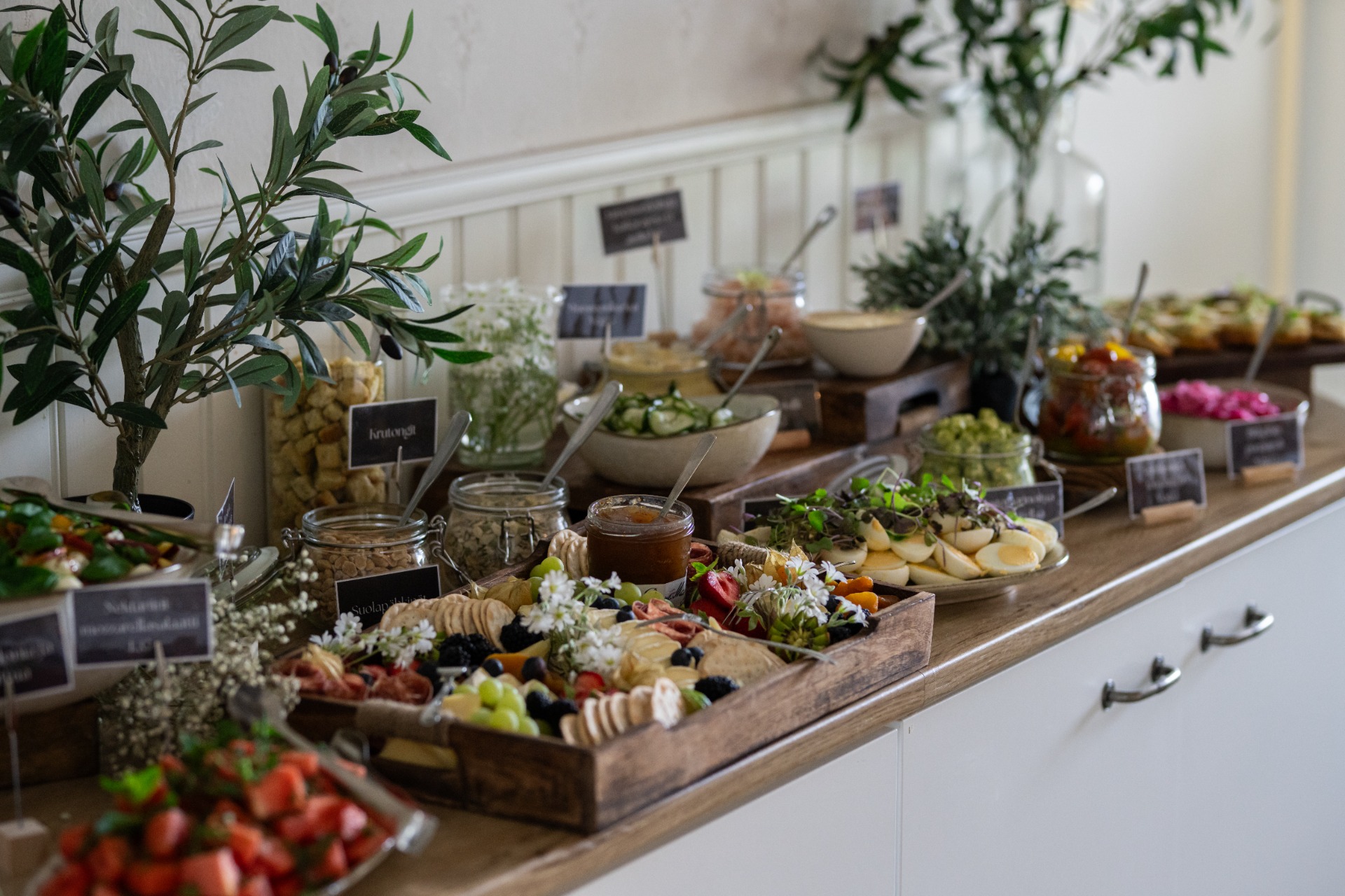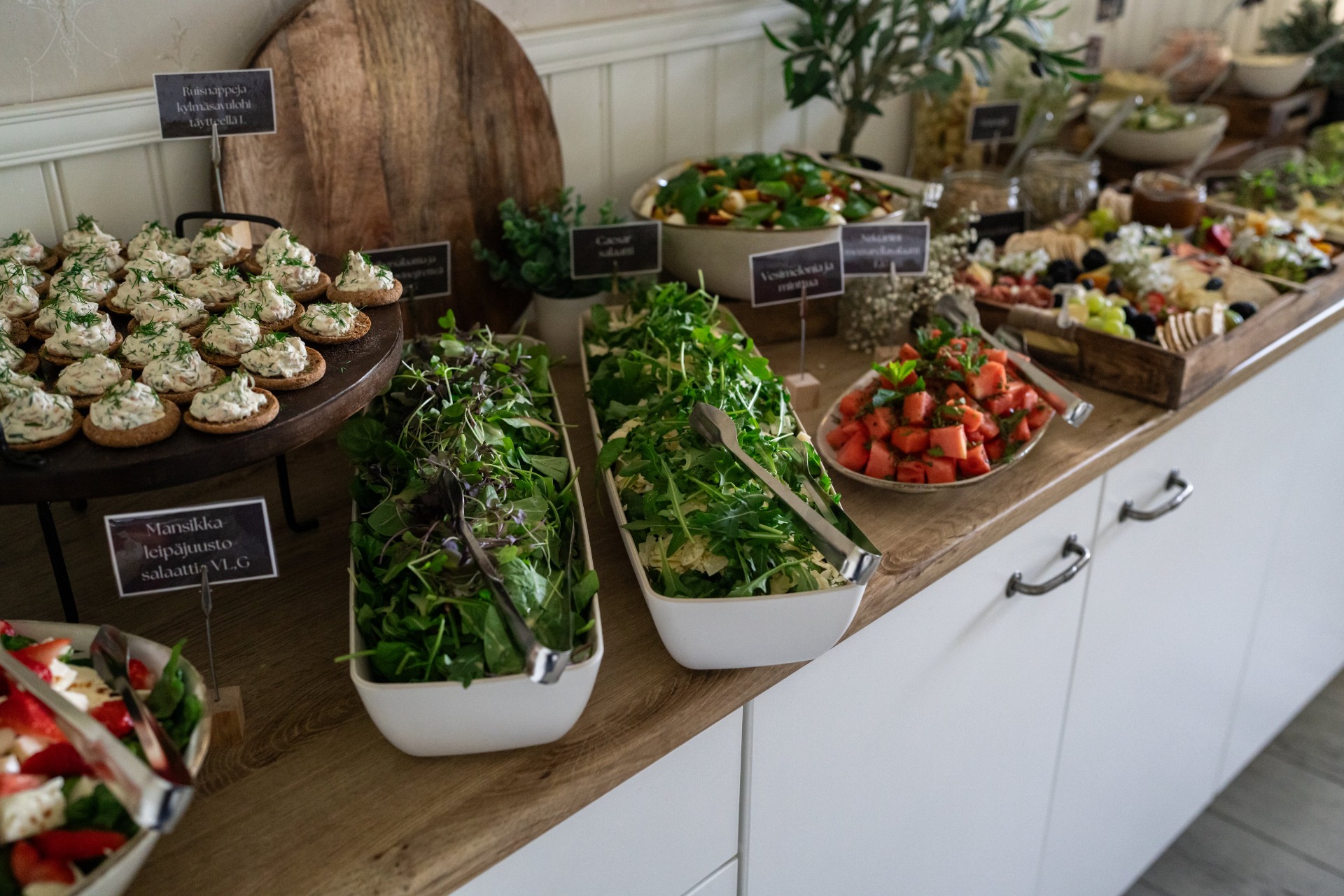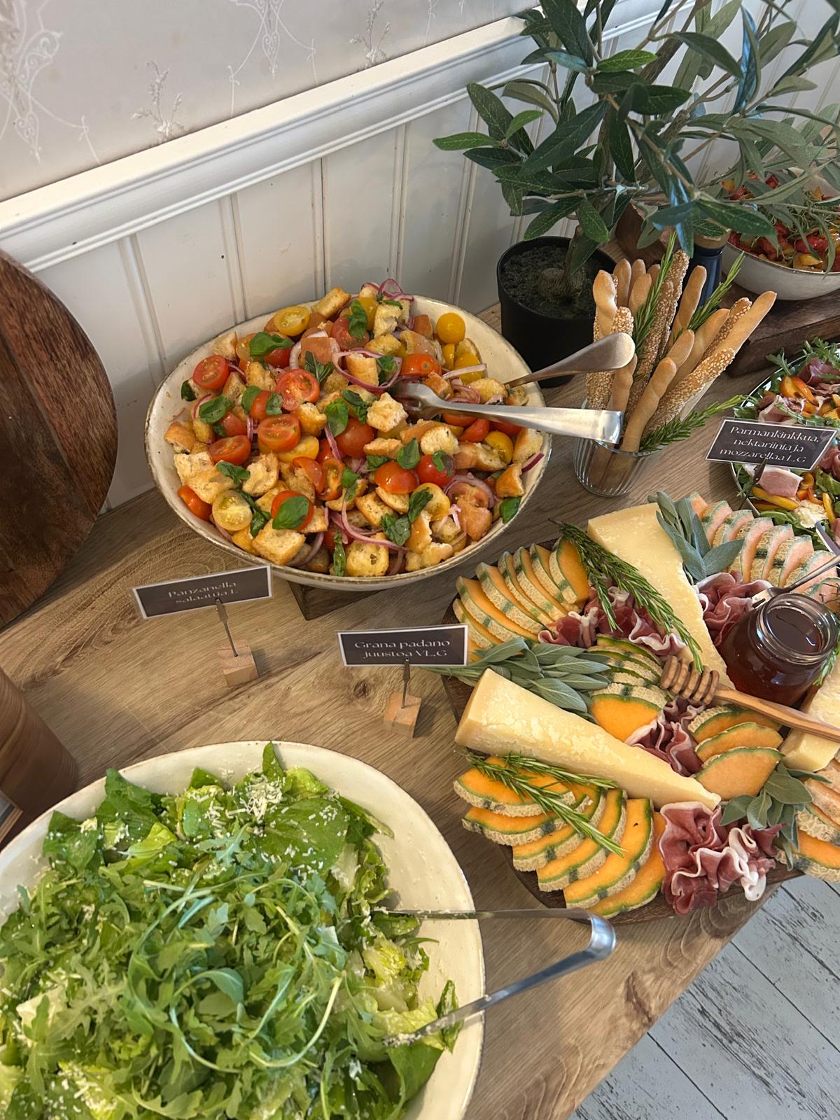 Hääbuffetiemme sydän on värikäs ja kaunis, sesongin raaka-aineista harkitusti koottu salaattien ja alkupalojen kokonaisuus. Viimeistelemme kattauksen häiden tyyliin ja värimaailmaan sopivaksi, jotta kokonaisuus tuntuu yhtenäiseltä.